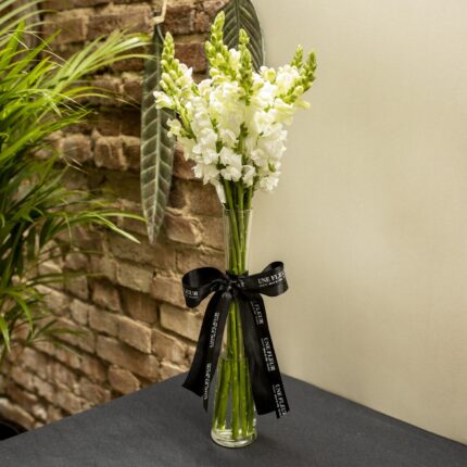 R$139,00 Em até 3x de R$50,09Vaso alto de vidro transparente com arranjo de Boca de Leão. Acabamento de laço de fita Une Fleur