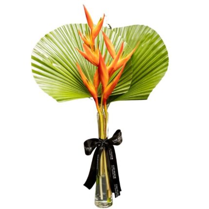 Ideal para decorar mesas de buffet ou cantos da casa, este arranjo de 3 hastes de heliconia e 2 folhas exala uma beleza simples e envolvente, criando um ambiente acolhedor e original.