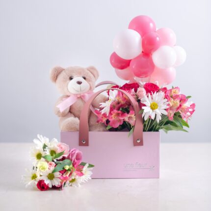 Encante a nova mamãe com nosso Kit Maternidade – Baby Born – Menina do nosso atelier floral “Une Fleur dans la Ville” em São Paulo. Ele nclui um buquê exclusivo de flores cor-de-rosa e brancas, cuidadosamente selecionadas para combinar harmoniosamente com a elegante caixa presente, adornada com alça de couro para um toque sofisticado. Completa o conjunto uma adorável pelúcia de ursinho com fita rosa e um conjunto de balões em tons de rosa, ideal para celebrar a chegada do bebê com alegria e cor. Cada detalhe deste kit foi pensado para transmitir carinho e felicidade, sendo perfeito para presentear em maternidades ou enviar diretamente para a casa da mamãe e do bebê. Aproveite nossa entrega rápida em São Paulo e celebre a chegada do pequeno com estilo e ternura.