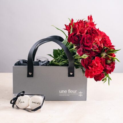 1 arranjo de flores da estação em tons vermelhos em uma caixa com alça de couro e 2 macarons.