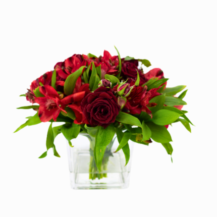 R$190,00 Em até 4x de R$52,34Flores Vermelhas – Luv é um arranjo sofisticado com rosas vinho e alstroemérias vermelhas em vaso de vidro. Um presente romântico e marcante para impressionar com elegância.