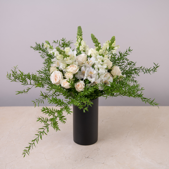 Com uma composição equilibrada de flores brancas delicadas, texturas verdes vibrantes e folhagens nobres, o arranjo transmite paz, renovação e frescor — exatamente o que se espera para começar um novo ciclo. O vaso de design clean complementa a proposta contemporânea, tornando-o ideal tanto para mesas de Réveillon quanto para ambientes sofisticados durante todo o ano.