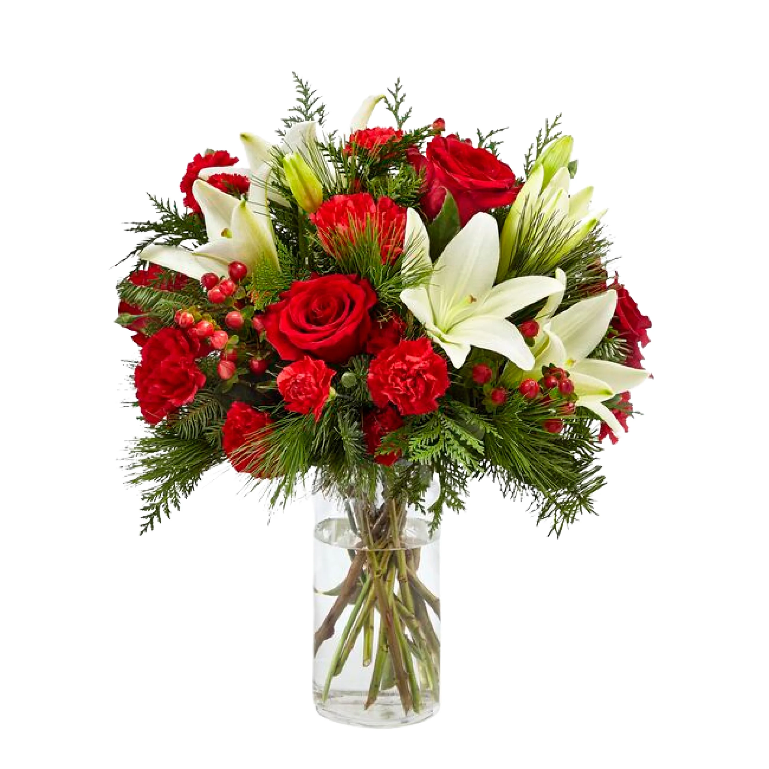 Composição: Lirio branco, rosa vermelha, impericum, folhagens verde e vaso transparente.