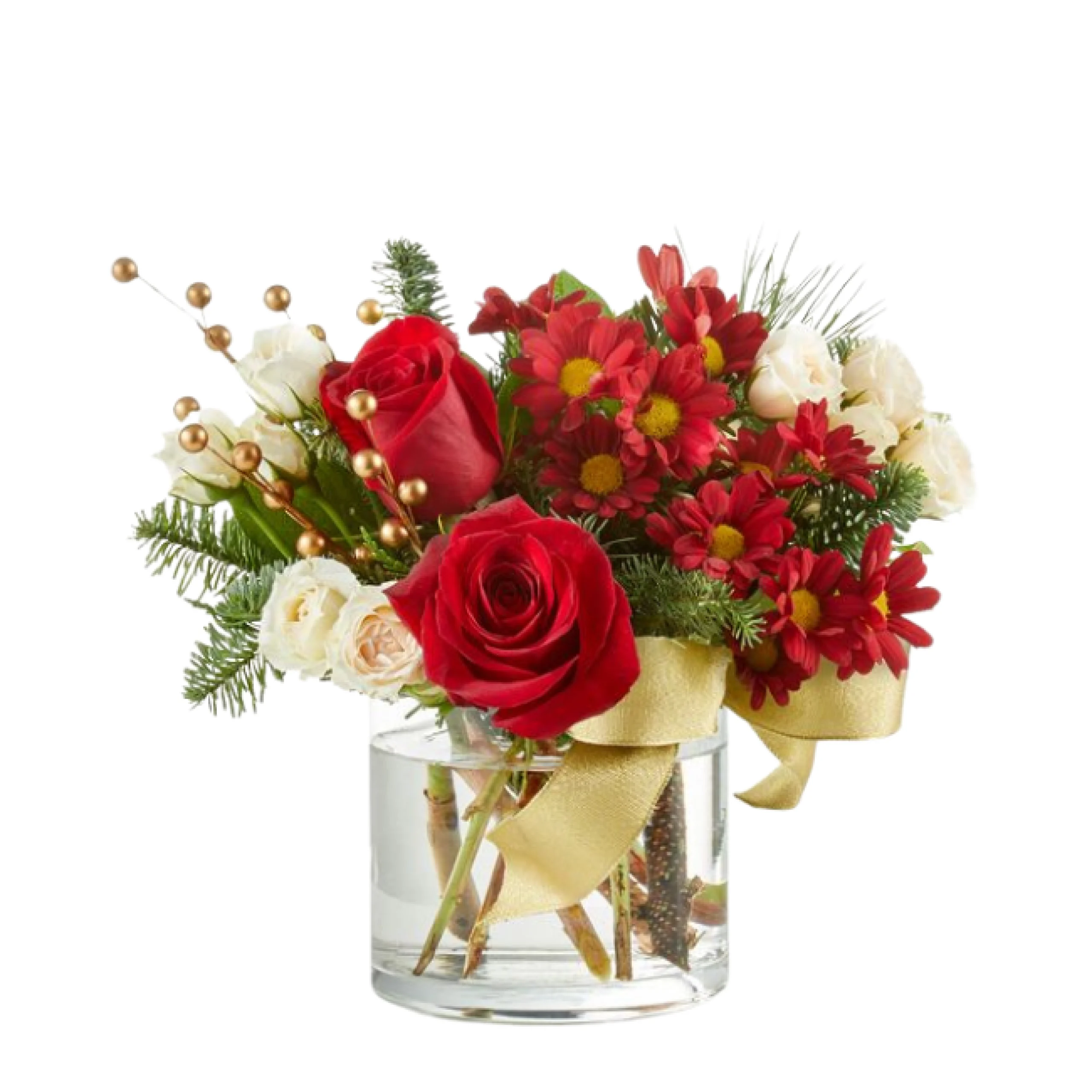 Composição: Rosa vermelha, rosa spray branca, margaridinha vermelha, detalhe dourado, folhagens verde e vaso transparente