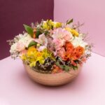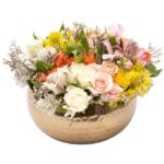 Apresentamos o arranjo floral Explosão de Cores em Dourado – Marie, uma peça vibrante e elegante projetada para encantar e celebrar momentos especiais. Este arranjo exclusivo combina a delicadeza das rosas em tons de pêssego, branco, amarelo e laranja , a beleza exótica da alstroeméria nos mesmos tons das rosas, e o toque silvestre do limonium. Cada flor é cuidadosamente disposta em uma sofisticada bacia dourada texturizada, que adiciona um toque de luxo e modernidade à composição.