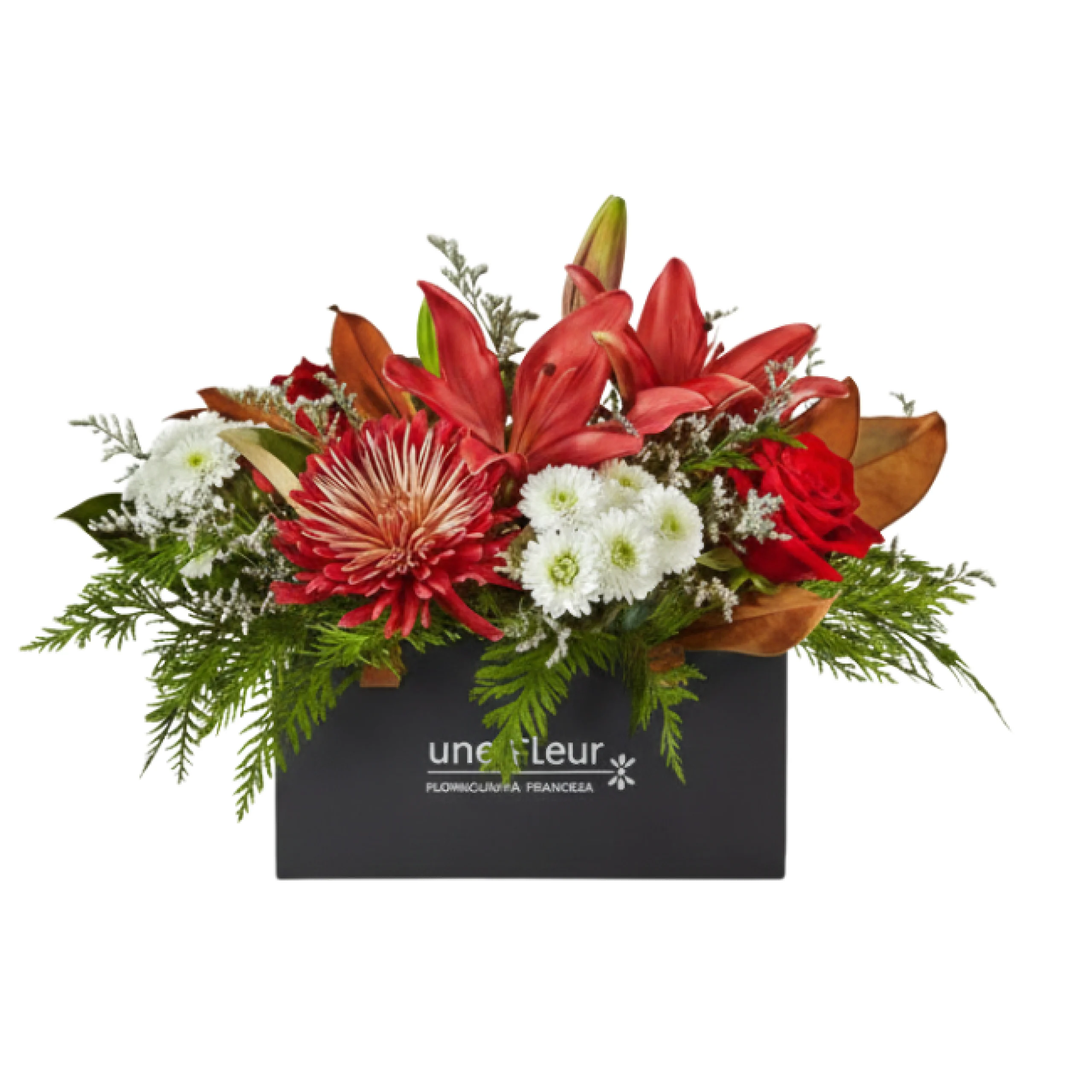 Composição: Crisantemo chispa, lírio vermelho, rosa vermelha, pompom, folhagens verde e caixa cartonada cinza da Une Fleur Dans La Ville