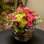 1 Arranjo de Rosas e astromelias no tom rosa, broto de hortensia e eucaliptus.