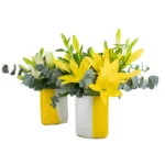 Celebre momentos especiais com este arranjo vibrante de lírios brancos frescos e folhas aromáticas de eucalipto, acomodados em um exclusivo vaso de vidro polonês Alicja bicolor, branco e amarelo. Criado pela Une Fleur dans la Ville, essa peça combina design moderno com a sofisticação das flores premium. Ideal para decorar salas, escritórios ou surpreender em ocasiões especiais, trazendo energia, frescor e estilo ao ambiente.