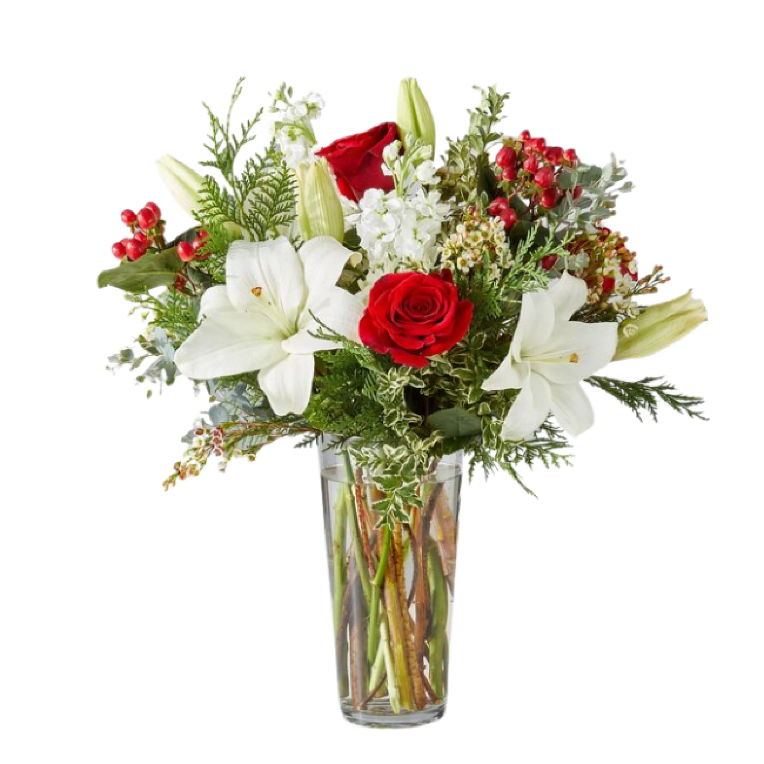 Composição: lírio branco, rosa vermelha, impericum, boca branca e vaso transparente