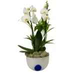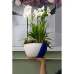 Uma peça de destaque. Esta não é apenas uma orquídea, é uma obra de arte viva. O arranjo de orquídeas brancas Phalaenopsis, símbolo de sofisticação e pureza, é plantado em um bowl de design polonês exclusivo, em tons de branco e azul cobalto. Um item de decoração que transforma qualquer ambiente, do escritório à sala de estar, adicionando um toque de “très chic”.